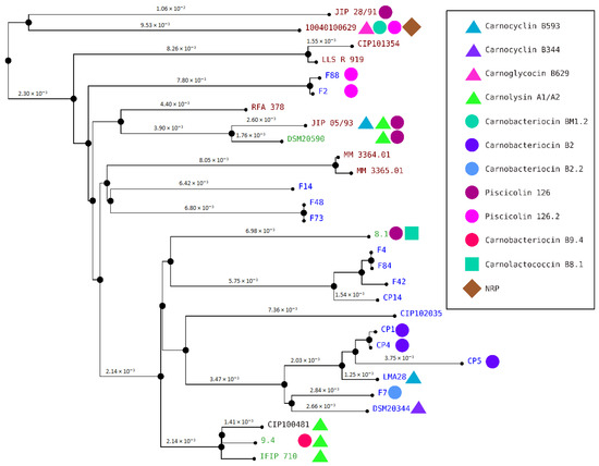 C. maltaromaticum genome clustering. The names of the C. maltaromaticum strains are indicated, in blue, green, dark red, and black when the strains were isolated from a dairy product, other food products, diseased fish, and human blood, respectively. Next to strain names, the symbols indicate the bacteriocin and the NRP predicted from the genome of the strains. The bacteriocin BM1 is not represented.