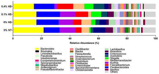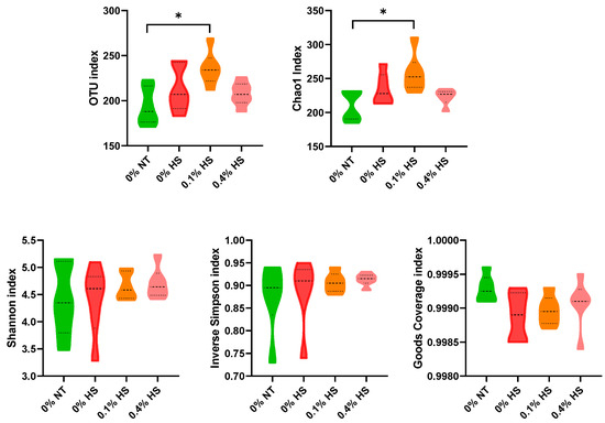 The alpha-diversity in the cecum samples was evaluated through community richness (OTUs and Chao1) and diversity (Shannon, inverse Simpson, and Good’s coverage indices) and is presented in Figure 2. The community richness evaluated through OTUs and Chao1 indices was significantly modified (p < 0.05) and higher in 0.1% HS in comparison to 0% NT birds. No significant variation (p > 0.05) was observed in the community diversity indices among the treatment groups.