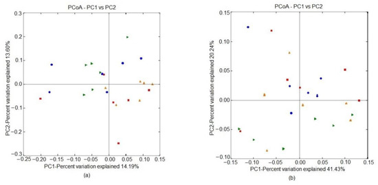 Effects of supplementing diets with solubles from shredded, steam-exploded pine particles (SSPPs) on the cecal microbiota composition assessed from unweighted (a) and weighted (b) Unifrac distances based on principal coordinate analysis (PCoA) in broiler chickens exposed to either thermoneutral or heat-stress conditions. Chickens were fed with diets containing 0% (control), 0.1%, and 0.4% solubles from shredded, steam-exploded pine particles (SSPPs) from the 8th day to the 36th day of age. On the 37th day, birds were either kept at thermoneutral temperature (21.0 °C) and provided a control diet (0% NT) or heat-stressed at 31.0 °C for six hours and provided a diet supplemented with 0% (0% HS), 0.1% (0.1% HS), or 0.4% (0.4% HS) SSPPs. Number of samples in each treatment (n = 6). Abbreviations: NT, normal temperature; HS, heat stress. The blue circle indicates 0% NT, the red square indicates 0% HS, the orange triangle indicates 0.1% HS, and the green triangle indicates 0.4% HS.