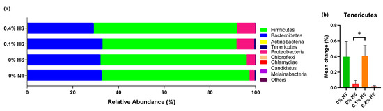 To evaluate the effects of dietary SSPP and HS on the microbial community in the broiler cecum, the phyla and genera of the microbes were determined. Firmicutes and Bacteroidetes were the two most abundant phyla present in the chicken cecum (Figure 4a; Table S2). Kruskal–Wallis test indicated that Tenericutes was significantly (p < 0.05) modified among treatment groups and Bonferroni correction revealed its higher abundance (p = 0.08) in the 0.1% HS group in comparison to the 0% HS group (Figure 4b).