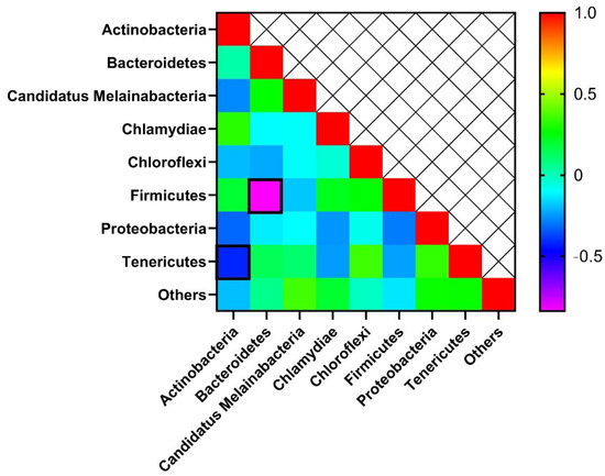 Firmicutes and Bacteroidetes were inversely correlated (Spearman R = −0.837, p = 0.001) with each other. Similarly, Tenericutes (Spearman R = −0.418, p = 0.042) was also inversely correlated with Actinobacteria (Figure 5).