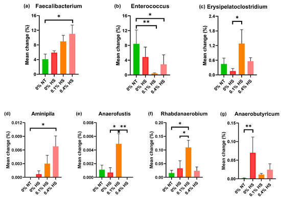 Effects of supplementing diets with solubles from shredded, steam-exploded pine particles (SSPPs) on the significantly modified genera Faecalibacterium, (a) Enterococcus, (b) Erysipelatoclostridium, (c) Aminipila, (d) Anaerofustis, (e) Rhabdanaerobium, (f) and Anaerobutyricum (g) in the ceca of broiler chickens exposed to either thermoneutral or heat-stress conditions. Chickens were fed with diets containing 0% (control), 0.1%, and 0.4% SSPPs from the 8th day to the 36th day of age. On the 37th day, birds were either kept at thermoneutral temperature (21.0 °C) and provided a control diet (0% NT) or heat-stressed at 31.0 °C for six hours and provided a diet supplemented with 0% (0% HS), 0.1% (0.1% HS), or 0.4% (0.4% HS) SSPPs. Data show means ± SEM (n = 6). Abbreviations: NT, normal temperature; HS, heat stress. * and **, significant differences at p < 0.1 and p < 0.05, respectively.