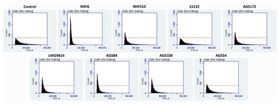 To evaluate this parameter, three bioprimed seeds were randomly collected to count bacterial cells adhering to their surface by flow cytometry, as described in the Section 2. Once again, strain RHF6 exhibited the best performance.