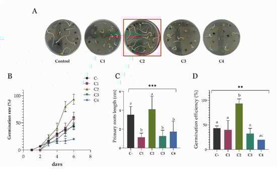 (A) Effects of seed-biopriming on S. oleracea. The red squares point out the treatments that gave the best results; (B) seed germination rate (%) measured over 6 days; (C) measure of the seedlings’ primary roots length by ImageJ software; (D) seed germination efficiency measured over 6 days—the comparison between the number of total germinated seeds over the number of total seeds on each plate is reported in percentage. Data are presented as means ± standard deviation (n = 3). For the comparative analysis of groups of data, one-way ANOVA was used, and p-values are shown in the figure: ***: extremely significant < 0.001. Different letters in each average indicate differences according to Dunnett’s test (p < 0.05).