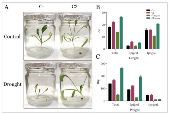 Effect of drought stress on the growth of in vitro cultures of S. oleracea. (A) The in vitro shoots, treated with 1X PBS (C-) or the bacterial consortium (C2), were cultured onto MS medium (0.7% agar) supplemented with +/− 5% PEG6000. The shoots’ total, epigeal and ipogeal length (B), and weight (C) were evaluated after 27 days of growth.