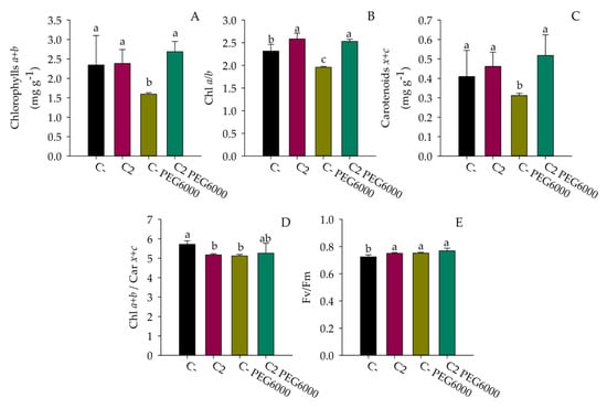 The water stress negatively affected the photosynthetic pigment content of spinach plants (C-PEG6000), inducing lower concentrations (p < 0.05) of total chlorophylls and carotenoids compared to untreated plants (C-) (Figure 5A,C). The PGPB treatment reversed this tendency, increasing the pigments (p < 0.05) in C2 plants even under drought stress (C2 PEG6000) (Figure 5A,C). Untreated and stressed control plants showed a reduced Chl a/b ratio which reached the lowest (p < 0.05) value under drought stress. On the contrary, the PGPB promoted (p < 0.05) the ratio a/b in the absence and presence of drought (Figure 5B). C2 and C-PEG6000 exhibited a reduced (p < 0.05) Chl/Car ratio compared to untreated plants (C-), but the PGPB treatments, in the presence of drought (C2 PEG6000), determined a value comparable to the control (Figure 5D). Finally, all treatments showed a higher (p < 0.05) Fv/Fm ratio than the untreated control (Figure 5E).