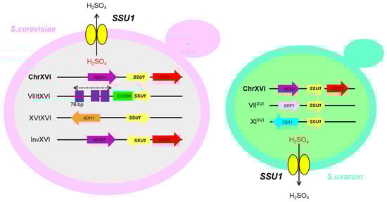 A later study observed other translocation between chromosomes XVI and XV (XVtXVI) that placed the SSU1 coding region head to tail under the control of the promoter of the ADH1 gene, which is constitutively expressed []. This chromosomic rearrangement was also correlated with higher SSU1 expression levels and sulphite resistance. Both events were traditionally found only in wine yeasts: the XVtXVI translocation being the less frequent, suggesting a more recent event in the evolution [,].