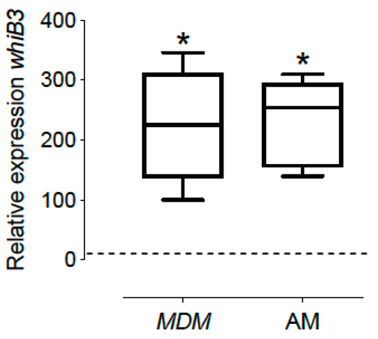Figure 1. whib3 expression of M. tuberculosis in intracellular bacteria in MDM and AM compared to aerobic in vitro 7H9 growth during mid-exponential growth phase (control, dashed line). Total RNA was isolated and real-time qRT-PCR was performed. Relative expression levels of whiB3 were estimated using the RNA 16S transcript as internal control for normalization of RNA amounts; expression levels from an in vitro culture were used as control. MDM: Monocyte-derived macrophages and AM: alveolar macrophages. The data show the maximums and minimums by quartiles. * p < 0.05 significant difference compared to the expression of control (bacteria cultivated in vitro), n = 6. The dashed horizontal line represents the median, and the Wilcoxon test was used to compare against the control.