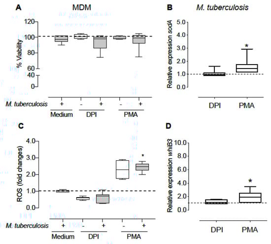 Figure 2. Effect of NOX activity modulation on gene expression of intracellular mycobacteria. The macrophages were treated with PMA (750 ng/mL) or DPI (20 µM) for 1 h. Subsequently, they were infected with M. tuberculosis (MOI 1:15) in the presence of PMA or DPI and incubated for another hour. The non-phagocytized bacteria were eliminated and fresh medium with PMA or DPI was added for 2 more hours. We detected cell viability (A) and ROS levels (C) in MDM. Furthermore, expression levels of whiB3 and sodA (B,D) were determined in intracellular bacteria. The data show the maximums and minimums by quartiles. * p < 0.05 significant difference compared to the expression of uninfected macrophages (A,C) or intracellular bacteria without treatment (B,D), n = 4–7. The Wilcoxon test was used to compare to the control. In panels (A,C), the dashed horizontal line represents the median of the uninfected macrophages without treatment, and panels (B,D), represents the median of the intracellular bacteria without treatment.