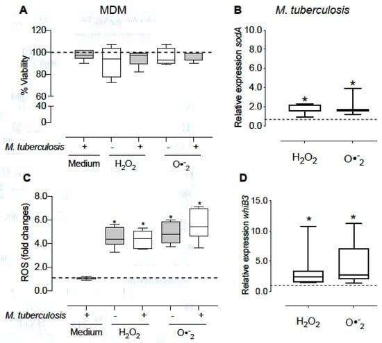 Figure 3. Effect of oxidizing agents on whiB3 and sodA gene expression of intracellular mycobacteria. The MDM were treated with 5 mM H2O2 and O2•− generator system for 15 min, and then infected with M. tuberculosis H37Ra (MOI 1:15) in the presence of these oxidants for 1 h. Non-phagocytized bacteria were removed, and fresh medium plus oxidants was added for 2 h. We detected cell viability (A) and ROS levels (C) in macrophages. Furthermore, the RNA expression levels of whiB3 and sodA (B,D) were determined in intracellular bacteria. The data show the maximums and minimums by quartiles. * p < 0.05 significant difference compared to the expression of uninfected macrophages (A,C) or intracellular bacteria without treatment (B,D), n = 4–8. The Wilcoxon test was used to compare to the control. In panels (A,C), the dashed horizontal line represents the median of the uninfected macrophages without treatment, and in panels (B,C), it represents the median of the intracellular bacteria without treatment.