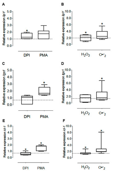 Figure 4. Expression of the lip-Y, tgs-1 and icl-1 in intracellular mycobacteria under oxidant conditions. The MDM were treated with NOX modulators (DPI and PMA) for 1 h or oxidizing agents (H2O2 and O2•−) for 15 min, and then infected with M. tuberculosis H37Ra (MOI 1:15) in presence of these oxidants for 1 h. Non-phagocyted bacteria were removed, and fresh medium containing NOX modulators or oxidants were added for 2 h. Then, we determined the expression of lip-Y (A,B), tgs-1 (C,D) and icl-1 (E,F). The data show the maximums and minimums by quartiles. * p < 0.05 significant difference compared to intracellular bacteria without treatment (control), n = 7–8. The dashed horizontal line represents the median of the control, and the Wilcoxon test was used to compare against the control (without treatment).