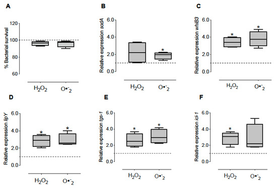 Figure 5. Effect of oxidizing agents on bacterial survival and gene expression of M. tuberculosis. Bacteria were grown in the presence of 5 mM H2O2 and O2•− generator system for 2 h. Then, we determined the survival (A) and the expression of sodA (B), whiB3 (C), lipY (D), tgs-1 (E) and icl-1 (F). The data show the maximums and minimums by quartiles. * p < 0.05 significant difference compared to the expression of the control, n = 4. The dashed horizontal line represents the median of the control, and the Wilcoxon test was used to compare against the control (untreated mycobacterial culture).