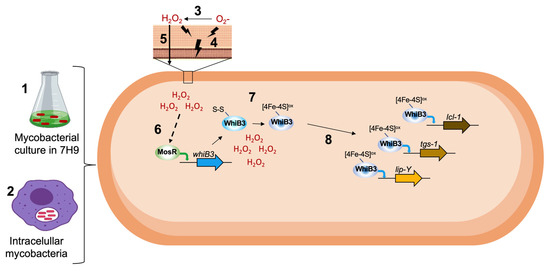 Figure 6. Effect of oxidants on gene expression of free-living mycobacteria cultured in 7H9 (1) and intracellular mycobacteria (2). The superoxide anion (O2) is converted into hydrogen peroxide (H2O2) (3). Both oxidants damage the cell wall and membrane, generating lipoperoxidation (4). H2O2 is an electrically neutral molecule that crosses membranes (5), increasing its concentration inside the cell causing an imbalance in the redox state. The MosR regulator senses oxidative stress and induces whiB3 expression (6). Oxidative conditions favor the [4Fe-4S] cluster oxidation of WhiB3 (7). [4Fe-4S]ox-WhiB3 can bind to promoters of its target genes (8), generating increased expression of lip-Y, tgs-1, and icl-1, causing a metabolic change that leads to a state of dormancy.