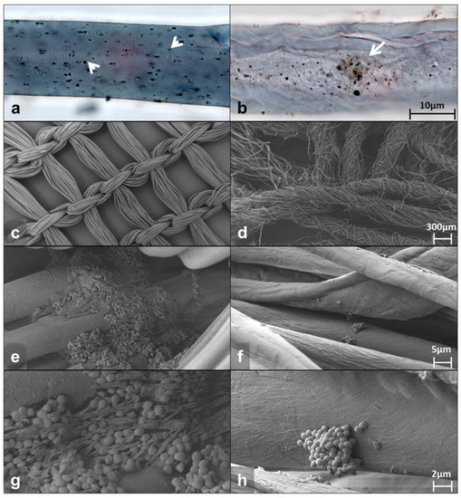 Bright-field microscopy of the fibers from the DACC-coated dressing or gauze showed abundant bacteria attached. Photomicrographs show single or small groups of bacteria adhering irregularly to the surface of the dressing (arrowheads in Figure 1a) and dispersed or aggregated cells at different depths in the gauze (arrow in Figure 1b). The DACC-coated dressing exhibited a wide distribution of bacteria, cotton gauze seemed to concentrate them in the middle portion of the fiber (Figure 1a,b). Typical S. aureus morphology and bacterial extracellular matrix deposition was confirmed by scanning electron microscopy (SEM) at high magnification (Figure S1). Furthermore, the pictures obtained by SEM showed that the DACC-coated dressing fiber presented a regular monofilament thread, opposite to cotton fiber, which was composed by several fine threads such as a rope (Figure 1c,d). After 3 h of culturing, S. aureus formed stable biofilms with an evident extracellular matrix in the DACC-coated dressing (Figure 1e,g); while planktonic cells and small colonies were observed among the cotton gauze fibers (Figure 1f,h).
