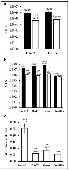 Quantification of CFUs and residual biomass in S. aureus cultures under different treatments: (a) Logarithms of mean CFUs of S. aureus retained in the dressings. The bacteria were cultured in Müller-Hinton broth (black bars) or supplemented DMEM (white bars); ***, p < 0.001 DACC vs. gauze, cultured in DMEM. (b) Logarithms of mean CFUs of S. aureus in the supernatants of cultures; **, p < 0.01 control vs. gauze, DACC vs. oxacillin; ***, p < 0.001 gauze vs. oxacillin, cultured in Müller-Hinton; **, p < 0.01 DACC vs. oxacillin; ***, p < 0.001 control vs. DACC, gauze, and oxacillin; DACC vs. gauze; and gauze vs. oxacillin, cultured in DMEM. (c) Mean of the residual biomass in the bottom of the well from the S. aureus cultures grown in DMEM. **, p < 0.01 DACC vs. gauze, gauze vs. oxacillin; ***, p < 0.001 control vs. DACC, gauze, and oxacillin. Error bars represent standard deviations.