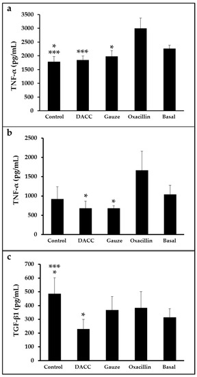 Expression of TNF-α and TGF-β1 in eukaryotic cell cultures: (a) Macrophages treated with the filtered supernatants of S. aureus cultured in Müller-Hinton broth. *, p < 0.05 control vs. basal and gauze vs. oxacillin; ***, p < 0.001 control vs. oxacillin and DACC vs. oxacillin. (b,c) co-cultures of fibroblasts and macrophages treated with the filtered supernatants of S. aureus cultured in DMEM. In (b), *, p < 0.05 gauze vs. oxacillin and DACC vs. oxacillin. In (c), *, p < 0.05 control vs. basal and DACC vs. oxacillin; ***, p < 0.001 control vs. DACC. Values are means ± standard deviations. The basal term refers to cytokine expression in the conditioned medium from non-unstimulated eukaryotic cultures.