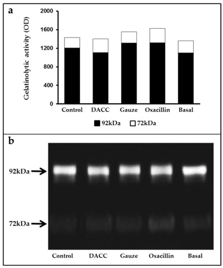 To determine whether the DACC-coated dressing could hold bacteria without lysis, we evaluated the effects of 0.22 µm filtrates of supernatants from S. aureus incubated with the dressing on macrophage cultures and fibroblast/macrophage co-cultures. Bacteria grew in Müller-Hinton medium or supplemented DMEM did not present altered eukaryotic cell growth (Figure S2); however, significantly reduced expression of TNF-α and TGF-β1 (Figure 3) and a proportional diminution of 92 kDa gelatinase activity (Figure 4) were observed in the eukaryotic cultures and co-cultures treated with the filtered supernatants of bacteria treated with DACC-coated dressing, when compared with the oxacillin-treated group. Those treated with gauze only presented reduced TNF-α expression.