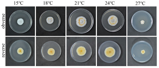 The growth rate of the strain QHLA growing at 15–24 °C was increased in a temperature-dependent manner, while significant inhibition was observed when the temperature reached 27 °C. The relationship between mycelium growth rate and the temperature was shown in Figure 3. When the temperature was 15 °C, the obverse side of the colony was white and the reverse side was milky-white. At 18 °C, the obverse side of the colony was white, with some yellow aerial mycelia in the middle, and the reverse side was light yellow. The obverse side of the strain was white, the middle circle was orange, and the reverse side was yellow, when the temperature was 21 °C and 24 °C. The mycelia shriveled and grew into the culture medium; it was brown along with the plate and yellow on the reverse side when the temperature was 27 °C.