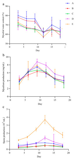 With the increase in incubation time, the mycelial water content; mycelium production; and spore production of the QHLA also changed. The water content of mycelia was the highest at the initial stage of culture, gradually decreasing with the advance of culture time, and it reached its lowest point at the 12th d of culture. After that, the water content of mycelia increased again. Both mycelium production and spore production had a trend of first increasing and then decreasing during the incubation time. Mycelium production reached the highest value on the 9th d, while spore production reached the highest value on the 12th d.