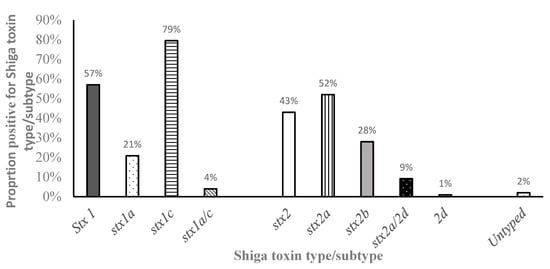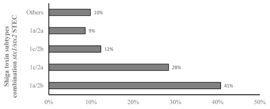 In STEC isolates that harbored both stx1 and stx2 genotypes, different combinations of stx subtypes were detected. Most of them contained a stx1a/stx2b genotype (41%), followed by stx1c/stx2a (28%), stx1c/stx2b (12%), and stx1a/stx2a (9%), while all other combinations were detected in 10% of the isolates (Figure 2).