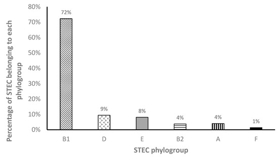 Based on the updated Clermont et al. phylogrouping method [31], STEC from goats belonged to six different phylogroups (Figure 3). Over seventy percent (72%) belonged to the phylogroup B1, while 9% and 8% belonged to groups D and E, respectively. Isolates belonging to phylogroups B2 and A were both 4%, while 1% of STEC belonged to phylogroup F.