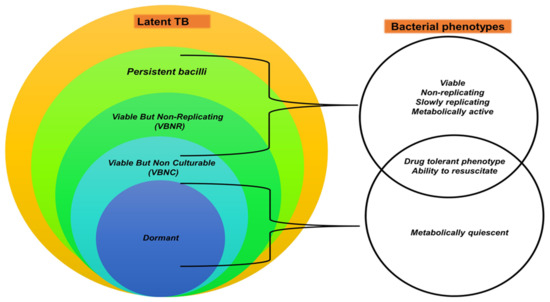 The hypothesis that different TB infection stages in humans are associated with different mycobacterial metabolic states has been proposed [204,205]. For instance, LTB has been linked to subpopulations of bacilli that are (i) viable but non or slowly replicating (VBNR) [224,225], (ii) viable but non-culturable (VBNC) [226,227], and (iii) metabolically inactive dormant bacilli [228]. Broadly, these subpopulations are categorised in the reversibly drug-tolerant, but not genetically drug-resistant population, termed “persisters” [227,229,230,231]; as shown in (Figure 1). Persister bacteria appear to be associated with LTB, incipient and subclinical infection [204,232,233], while actively replicating (AR) mycobacterial populations are present in ATB [204]. Even though human TB research has progressed, additional research is needed to fully understand these hypothesised TB stages in humans.