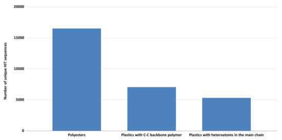 After aligning all 124-input degrading-genes against 669 Rhodococcus genomes, the total number of identified sequences was almost 50,000 (Table S2), and within them, only the unique sequences were further considered. They were classified into three main polymer categories as shown in Figure 2. The highest number of sequences was in the polyester group (16,528 sequences) followed by C−C backbone plastics and heteroatomic backbone plastics groups (respectively 7069 and 5340 sequences, respectively). This is in line with the highest number of input-degrading genes related to the polyester group and also their general higher biodegradability.