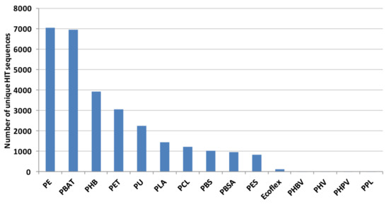 Considering each polymer, the highest number of Rhodococcus DNA sequences encodes proteins putatively related to the degradation of PE, PBAT, PHB, PET, and PU; a few genes cover PHBV, PHV, PHPV, and PPL degradation (Figure 3).