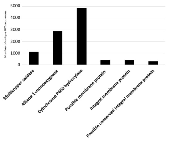 The degradative potential of the Rhodococcus genus towards C-C backbone polymers was evaluated including only PE-degrading genes, since other polymers, such as polypropylene (PP), were correlated to similar genes associated with PE-degradation [44], or polystyrene (PS) and polyvinyl chloride (PVC), whose biodegradation is supported by few studies that did not focus on the molecular aspects and genetic determinants for these metabolisms [21]. The considered input genes encode alkane 1-monooxygenases, multicopper oxidases, cytochrome P450 hydroxylases, and transporters (possible membrane protein, integral membrane protein, and possible conserved integral membrane protein). The results of the bioinformatic analysis are shown in Figure 6 where the number of unique HIT sequences identified in Rhodococcus genomes is reported for different enzyme categories putatively related to C−C backbone plastic degradation. Figure 6 shows that the highest number of unique HIT sequences identified in Rhodococcus species belongs to the cytochrome P450 hydroxylase group (4864 sequences).
