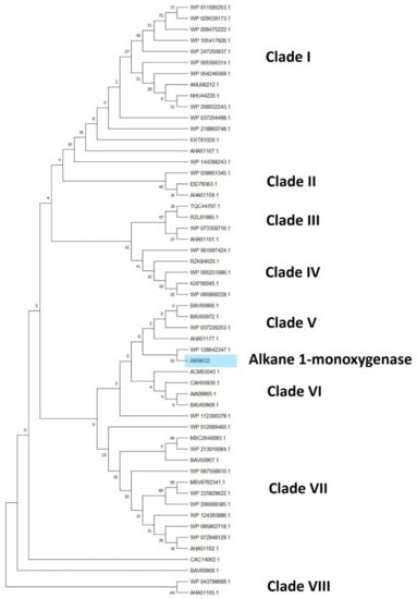 Considering the alkane monooxygenase subtree, eight clades can be distinguished comprising only alkane 1-monooxygenase (AII08632), belonging to the same species observed in the previous subtree (Figure 7) with the addition of R. rhodochrous and R. aetherivorans species (Figure 8). The closest sequences with respect to the reference input AII08632 belong to the R. wratislaviensis and R. jostii species.