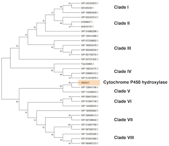 Cytochrome P450 hydroxylase subtree showed sequences belonging to Rhodococcus sp., R. opacus, R. wratislaviensis, R. imtechensis, R. jostii, and R. koreensis, which clusterized into eight clades (Figure 9). The reference sequence AII08421 principally clusterized with cytochrome P450 of R. wratislaviensis (WP_112300243) and the closest clade include cytochrome P450 of all the species mentioned in the previous subtrees except R. jostii (WP_012691738, WP_009475556, WP_144285016, WP_124393366, WP_095862123, WP_072937090, WP_185950062, WP_007299636, WP_087560732, WP_218267768, and WP_206009113).