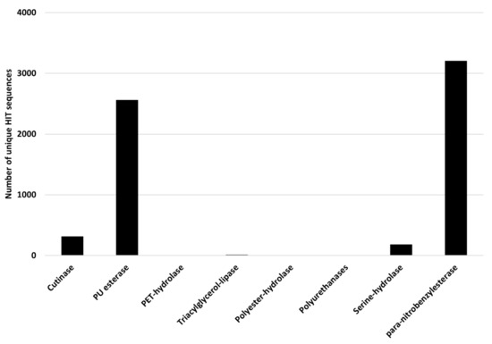 Rhodococcus degrading potential for plastics with heteroatoms in the main chain was evaluated by selecting PET and PU degrading genes as references. The considered input genes encode cutinase, PU esterase, PET-hydrolase, triacylglycerol-lipase, polyester-hydrolase, polyurethanase, serine-hydrolase, and para-nitrobenzylesterase. The results of the comparison of Rhodococcus genomes against these reference sequences are shown in Figure 10, where the number of unique HIT sequences identified in Rhodococcus genomes is reported for different enzyme categories putatively related to heteroatomic backbone plastic degradation. The highest number of unique HIT sequences identified in Rhodococcus species belongs to PU esterase and para-nitrobenzylesterase groups (3205 and 2561 unique sequences, respectively).