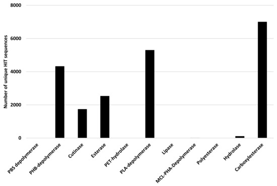 Polyesters are often considered biodegradable polymers [27]; thus, Rhodococcus degrading potential has been assessed for all genes related to PBAT, Ecoflex, PHB, PHA, PLA, PCL, PPL, PBS, PBSA, PES, PHBV, PHPV, and PHV degradation. The considered input genes encode PBS depolymerase, PHB-depolymerase, cutinase, esterase, PET-hydrolase, PLA-depolymerase, lipase, MCL-PHA-Depolymerase, polyesterase, hydrolase, and carboxylesterase. Figure 12 shows the results of the bioinformatic analysis where the number of unique HIT sequences identified in Rhodococcus genomes is reported for different enzyme categories putatively related to polyester degradation. The three enzymatic classes with the highest number of unique HIT sequences of Rhodococcus species belong to carboxylesterase (7007 sequences), PLA-depolymerase (5302 sequences), and PHB-depolymerase (4328 sequences) groups.