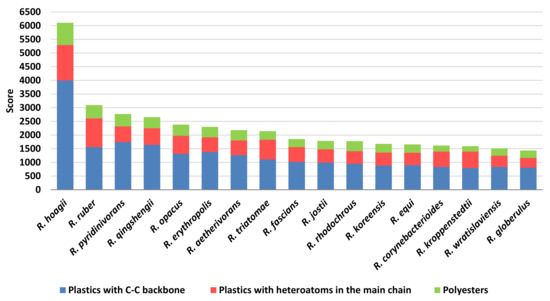 On the other hand, score values highlighted PE-degrading sequences as the most probably involved especially for R. pyridinivorans, R. qingshengii, and R. hoagii genera [48,49], which have the highest PE-degrading potential. With respect to C−C backbone plastic gene products, R. triatomae presented the highest score if we consider only human-associated species, as mostly reported in the literature [50,51]. This high similarity for PE-degrading enzymes is probably due to the Rhodococcus strain origin of the majority of input sequences related to this class of polymers [17,31]. The association of the diverse species of Rhodococcus genus to diverse niches could be a useful hint to predict the most promising ecological niches, where rhodococci could be prominent in plastic degradation.