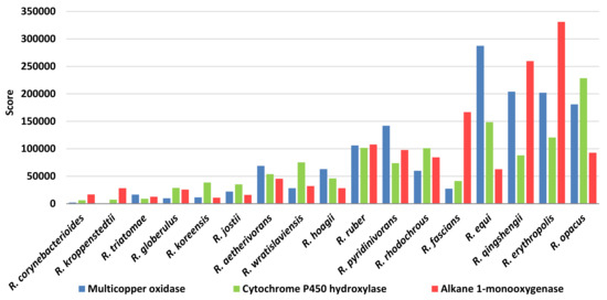 Analyzing the score of the different enzymes identified for the biodegradation of synthetic and biodegradable plastics, multicopper oxidases, alkane 1-monooxygenases, and cytochrome P450 hydroxylases were the enzymes of major interest for C−C backbone plastic group (Figure 14). Alkane 1-monooxygenase class possesses the highest score value for R. erythropolis and R. qingshengii; multicopper oxidase class is prominent in R. erythropolis, R. qingshengii, R. opacus, and R. equi; cytochrome P450 hydroxylase category presented the highest score values for the R. opacus and R. erythropolis species. Worthy of being specified is the apparent contradiction for R. hoagii score values for C−C backbone plastic-degrading genes. Probably, the considerable score levels are primarily due to other enzymes considered, such as transporters and membrane proteins.