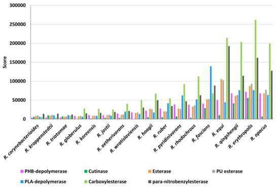 The scores of the other two plastic-degrading enzyme categories related to heteroatomic backbone plastics and polyesters were simultaneously analyzed because of the overlapping capabilities of these enzymes (Figure 15). Above all, carboxylesterase showed the highest scores and, in particular, R. erythropolis, R. qingshengii, R. opacus, and R. equi were the most prominent species. A similar score-species pattern was observed for para-nitrobenzylesterase, PU esterases, and esterases, with the exclusion of R. qingshengii. PLA-depolymerase presented the highest score values for R. fascians species. The scores for PHB-depolymerase were mostly the highest in R. erythropolis, R. qingshengii, R. opacus, R. rhodochrous, and R. pyridinivorans. On the other hand, cutinases presented average low score values; the highest was shown for R. erythropolis, R. qingshengii, and R. fascians species.