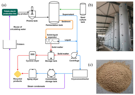 (a) Industrial reutilization biotechnology of potato starch by-products from a plant with an annual output of 1000 tons of starch and composed of three parts: Microbial fermentation production line, Solid-liquid separation production line, Drying and recovery production line. (b) Real photo of Microbial fermentation production line in the factory. (c) Recycled products.