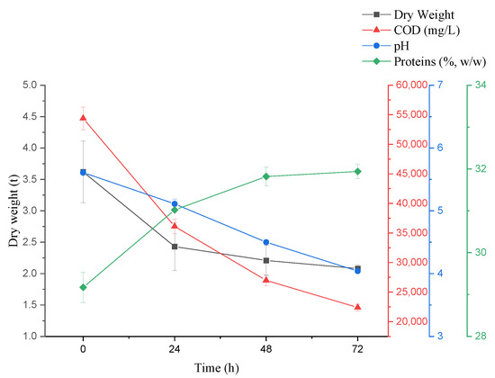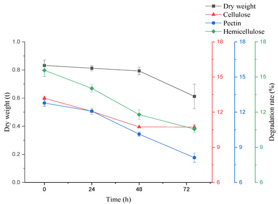 Microbial fermentation decomposed and metabolized biomass [4]. Analyzing the changes of by-product components before and after fermentation intuitively verified the conversion effect of A. niger on by-products and provided mechanistic insights or factors that influence flocculation. Several experiments analyzed the primary by-product components before and after fermentation. Samples were taken after 24 h, 48 h, and 72 h, then layered for 2 h. The supernatant was used to determine COD levels, pH, and protein content. The precipitates were gathered and dried at 80 °C for 24 h, ground, and passed through 100 mesh sieves to determine cellulose, hemicellulose, and pectin levels.