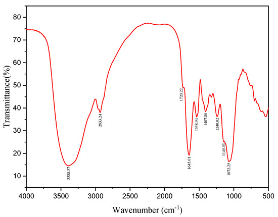The FTIR spectrum of FS (Figure 6) shows typically broad and sharp stretching vibrations between 3000–3700 cm−1, and the broad absorption wavelength at the peak of 3388.37 cm−1 was from -OH stretches (polysaccharides) and amino groups (proteins). The peak at 2933.85 cm−1 was due to asymmetric CH sugar stretches; the peak at 1720.22 cm−1 was characteristic of C=O stretching vibrations in -COOH, while the peak at 1645.01 cm−1 was due to C=O stretching vibrations caused by the protein amide bond, that confirmed the presence of carboxylates [37]. The peak at 1407.80 cm−1 was caused by variable angle C-H vibrations; the peaks at 1240.02 cm−1 and 1072.25 cm−1 were attributed to two kinds of C-O stretching vibrations—the C-O-C characteristic absorption peak of ether in polysaccharides ring, and a C-O-H absorption peak, characteristic of all sugar moieties [45]. The weak absorption at 927.61 cm−1 indicated the polysaccharides contained a β-Type glycosidic bond. Those results indicated the FS functional groups comprised hydroxyl, carbonyl, carboxyl groups, and amide groups, which have a high binding capacity in flocculation.