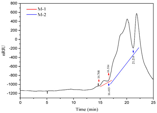 The FS molecular weight distributions were highly important, particularly when bridging was the primary flocculation mechanism [27]. GPC chromatography showed that FS had a bimodal molecular weight distribution (Figure 7). The average molecular weight (Mw), molecular mass (Mn), and polydispersity (PDI) results are shown in Table 1. The Mw, Mn, and PDI of M-1 were 7.3792 × 106 Da, 7.2665 × 106 Da, and 1.0156, respectively. The Mw, Mn, and PDI of M-2 were 1.7741 × 106 Da, 1.4987 × 106 Da, and 1.1838, respectively. The molecular weight distributions of the two polymers are shown in Figure S1. FTIR results showed protein functional groups in FS. In addition, full band scanning and protein content detection of FS also suggested the double peaks of GPC chromatography might be due to proteins and polymer compositions by polysaccharides and proteins. Given that the biopolymer molecular masses with flocculation activity generally exceed 0.102 × 106 Da, flocculants with higher molecular masses involve more adsorption points for bridging and resulted in larger flocs [46,47]. The two molecular weight distributions of FS were considerably higher than 0.102 × 106 Da, which provided the building blocks for bridging during flocculation. In addition, the flocculant with two molecular masses distributions demonstrated a better flocculation effect [48].