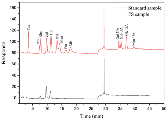 Monosaccharide ion chromatogram of polysaccharide: the red line represents mixed monosaccharides standard, and the black line represents the FS sample.