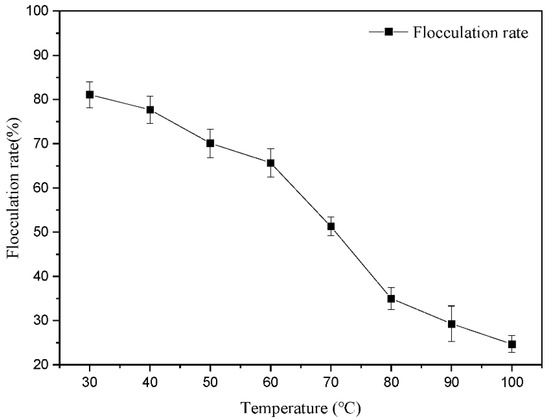FS solutions were heated for 30 min at different temperatures, then cooled to room temperature to flocculate the kaolin suspension. The flocculation rate reached 81.10 ± 2.91% after heating at 30 °C and decreased at higher temperatures. The lowest flocculation rate occurred when FS was heated at 100 °C and decreased by 69.54%. These results indicated that temperature significantly impacted the flocculation of FS, which may stem from bond dissociation between proteins and polysaccharides or the disintegration of the flocculation system caused by protein structure changes at higher temperatures (Figure 10). A similar study demonstrated flocculants with protein as the main chain was sensitive to temperature [53]; this may explain the presence of proteins and polysaccharides in FS, which polymerize and adsorb particles to generate flocculation.