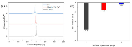 Zeta potentials of kaolin, kaolin + FS + Ca2+, and FS, respectively. Black solid lines and columns represent kaolin; red solid lines and columns represent kaolin + FS + Ca2+; and blue solid lines and columns represent the potential of FS, respectively. (a) Zeta potential frequency diagram (b) Zeta potential in different experimental groups.