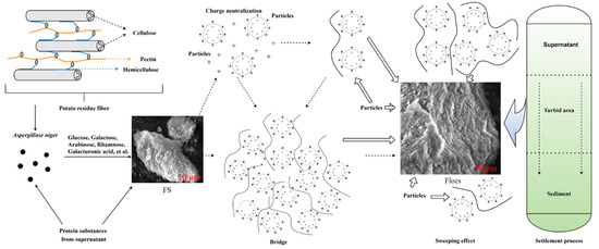 The functional group analysis results indicated the main functional groups in FS were hydroxyl, carboxyl, and amido groups; all provide adequate bridging sites [54]. SEM observations showed the FS surface had a prismatic structure and surface depressions, which provided additional surface area and bridging sites. The higher molecular weight provided more binding sites for bridging flocculants, which resulted in higher flocculation activities and larger flocs formation [54]. The two molecular weight distributions had better flocculation effects and more readily formed large flocs [48]. This indicated the primary flocculation by FS was bridging. However, the influence of pH on flocculation rate was limited and the change in flocculation rate was <20%. This indicated that charge adsorption was not the main flocculation mechanism. Differences in EPS polysaccharides secreted by microorganisms [55], indicated many FS polysaccharides came from potato starch by-product decomposition, especially hemicellulose and pectin. This indicated that the FS synthesis related to pectin and hemicellulose degradation and agreed with a previous study [44]. The sensitivity of FS to temperature indicated that glycoprotein in FS might drive flocculation. In practical sedimentation process, FS formed large flocs with particles via charge neutralization and adsorption bridges, and the large flocs attracted each other more easily to form a grid structure. SEM results demonstrated that the flocs were closely connected and formed a sweeping effect to reduce COD in the wastewater. The previous study showed that a bioflocculant (MBFA18) produced by fermentation of potato starch wastewater (juice) by A. niger was mainly polysaccharide [56]. Differently, A. niger was used to convert all the by-products simultaneously, and the flocculating substances (FS) generated were predominantly protein and polysaccharide in this study. The stability of FS is related to the different components of flocs. Flocs mainly containing protein are affected by temperature, while polysaccharide is relatively less affected, which is consistent with the results of the studies [12,13,44]. The factors affecting flocculation can be summarized as the active components of the flocculant, the products of different microorganisms and the raw materials, etc. Previous studies have shown that by using different sources of microorganism flocculants to floc potato starch wastewater, the predominantly flocculant mechanism was adsorption bridging.