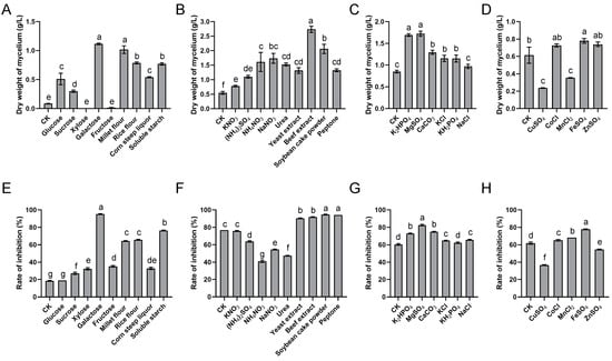Effect of different nutrient sources on the biomass yield and antifungal metabolites production of S. alfalfae XN-04. (A,E) Effect of carbon sources. (B,F) Effect of nitrogen sources. (C,G) Effect of mineral salts. (D,H) Effect of trace elements. The dry weight of mycelium was used as indication of biomass, and the rate of inhibition was used as indication of antifungal metabolites production. Bars represent the SD of three replicates. Different lowercase letters indicate a significant difference at p < 0.05 level by Duncan’ s new multiple range test.