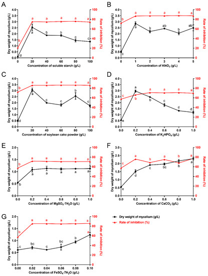 Effect of nutrient sources at different concentrations on the biomass yield and antifungal metabolites production of S. alfalfae XN-04. (A) Soluble starch. (B) KNO3. (C) Soybean cake powder. (D) K2HPO4. (E) MgSO4·7H2O. (F) CaCO3. (G) FeSO4·7H2O. The dry weight of mycelium was used as indication of biomass (corresponds to the left X axis), and the rate of inhibition was used as indication of antifungal metabolites production (corresponds to the right Y axis). Bars represent the SD of three replicates. Different lowercase letters indicate a significant difference at p < 0.05 level by Duncan’ s new multiple range test.