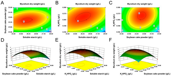 Contour plot described by the model on mycelial dry weight. (A) Effect of soluble starch and soybean cake powder. (B) Effect of soluble starch and K2HPO4. (C) Effect of soybean cake powder and K2HPO4. Response–surface curve of mycelial dry weight showing mutual interactions. (D) Soluble starch and soybean cake powder. (E) Soluble starch and K2HPO4. (F) Soybean cake powder and K2HPO4. Other variables, except for the two in each figure, were maintained at zero level in coded units. The numbers 2–6 in the figure indicate the mycelium dry weight at this location.