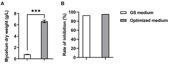 Validation of statistical optimization medium and the initial medium (GS medium). (A) Mycelial dry weight. (B) Rate of inhibition. Bars represent the SD of three replicates. *** indicates statistical significance based on the two-tailed test (p < 0.0001).