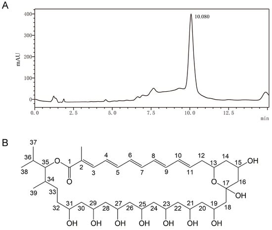 A series of chromatographic procedures were performed to purify the main antifungal ingredient in the MeOH extract of S. alfalfae XN-04. A total of 10 fractions were obtained from the silica gel column chromatography (Figure S1), among which Fr. 5–9 exhibited antifungal activity (Table S1). Fr. 5 demonstrated strong antifungal activity, producing a radius of inhibition zone > 14 mm. Therefore, Fr. 5 was subjected to semi-preparative HPLC for further purification. The chromatogram was monitored at 363 nm, and a peak (compound 1) was observed at the retention times of 10.08 (Figure 5A). Finally, compound 1 was obtained as a yellow amorphous solid. The results of LC-MS/MS showed that the most abundant high mass ion [M + H]+ was found at m/z 739.4619 (Figure S2). Compound 1 was identified as roflamycoin (molecular weight, 738; molecular formula, C40H66O12) by comparing its NMR data (Table S1) with the previous study [32].