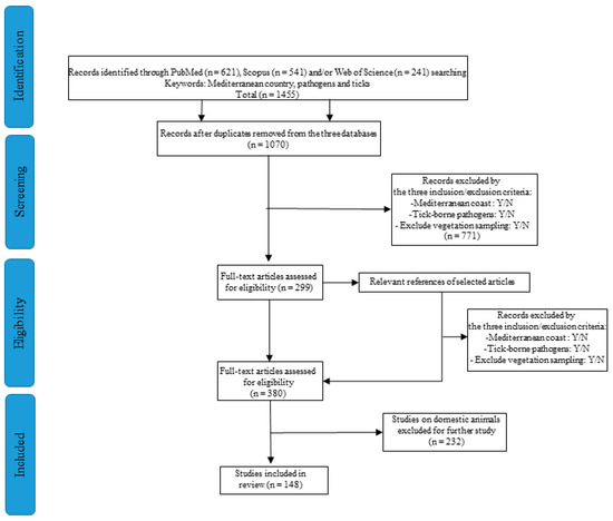 Publications targeting TBPs in wild animals and/or in engorged ticks collected from wildlife in Mediterranean countries were included. This gave us an overview of research on TBP-positive ticks supposedly infesting hosts and TBPs circulating among the wild animal population. The articles were saved if the answer to all three questions was “yes” and eliminated otherwise. The next step entailed reviewing the information of interest from the full text of 299 articles into a database. We also excluded articles that did not fit the criteria.